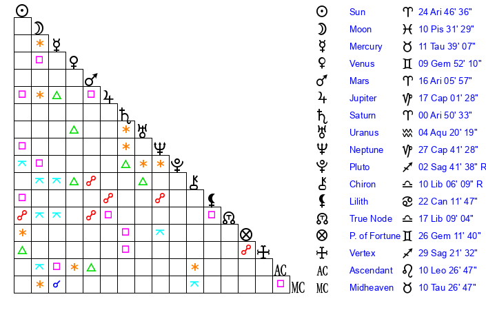 | Sun | 24 Aries 35 | 24 Aries 34 | 22 Taurus 46 |