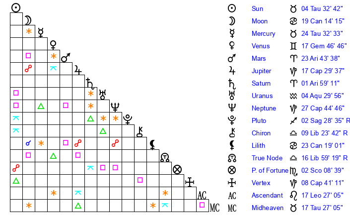 | Sun | 4 Taurus 21 | 4 Taurus 20 | 2 Gemini 24 |