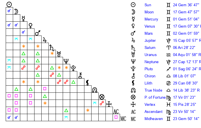 | Sun | 24 Gemini 26 | 24 Gemini 25 | 22 Cancer 5 |