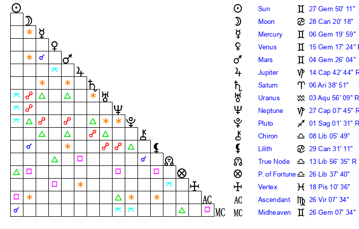 | Sun | 27 Gemini 18 | 27 Gemini 17 | 24 Cancer 57 |