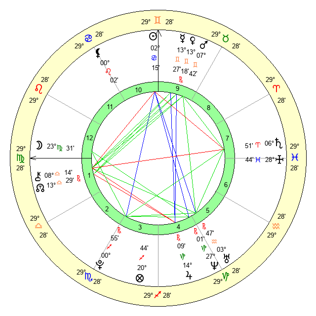 | Moon | 21 Virgo 9 | 2 Gemini 12 | 12 Libra 24 |