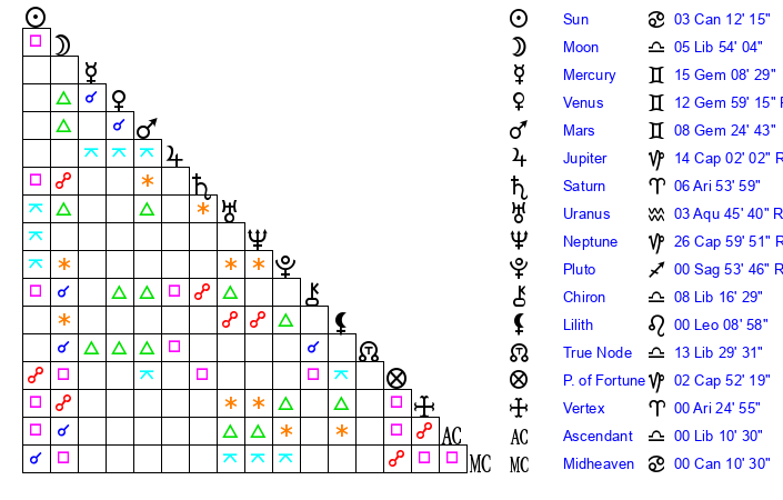 | Moon | 3 Libra 26 | 16 Gemini 59 | 24 Libra 58 |