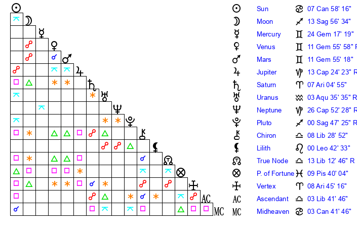 | Mars | 11 Gemini 48 | 6 Virgo 46 | 1 Cancer 41 |