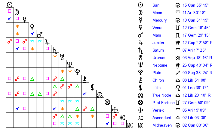 Moon | 8 Aries 59 | 4 Sagittarius 12 | 1 Taurus 40 |