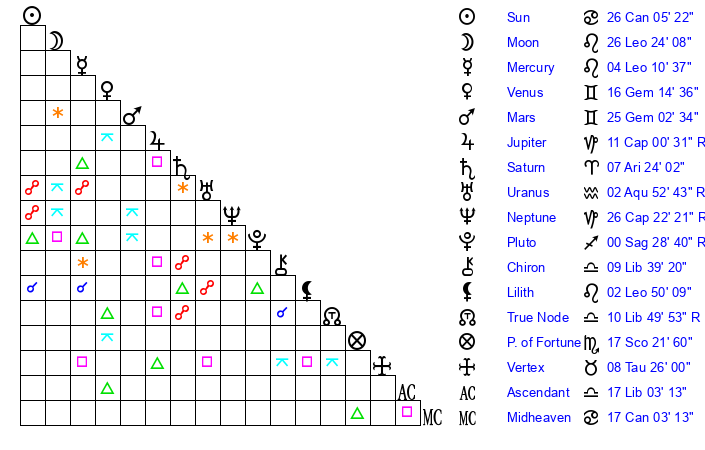 | Neptune | 26 Capricorn 22 | 2 Aries 7 | 25 Capricorn 37 |