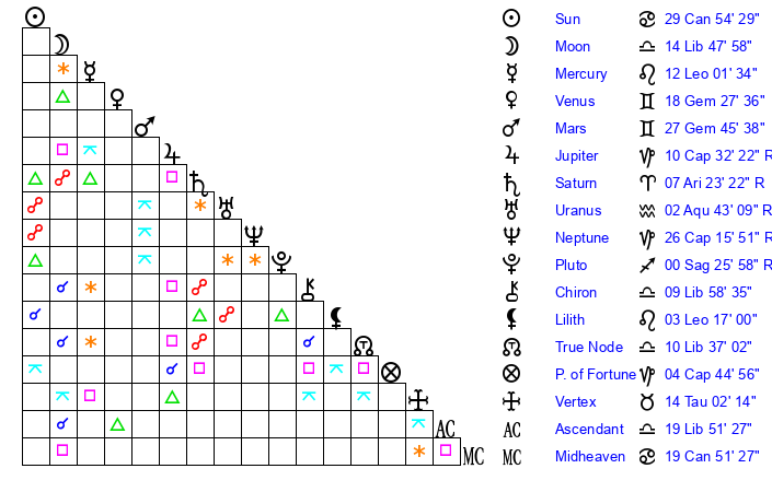 | Moon | 12 Libra 24 | 26 Gemini 22 | 4 Scorpio 35 |