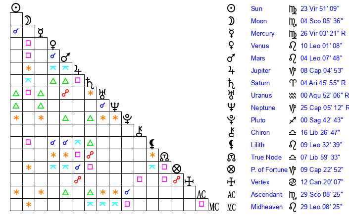 | Sun | 23 Virgo 40 | 23 Virgo 39 | 22 Libra 11 |