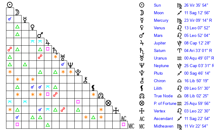 | Sun | 26 Virgo 36 | 26 Virgo 35 | 25 Libra 9 |
