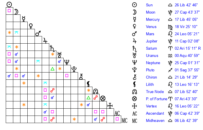 | Moon | 19 Capricorn 43 | 1 Libra 8 | 14 Aquarius 52 |