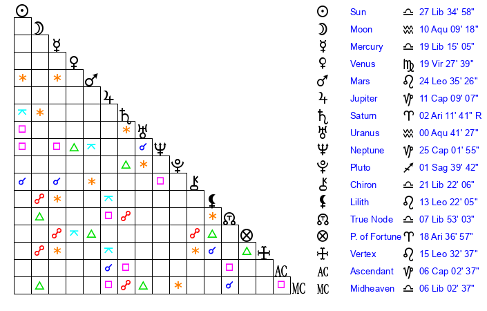| Sun | 27 Libra 9 | 27 Libra 7 | 26 Scorpio 12 |
