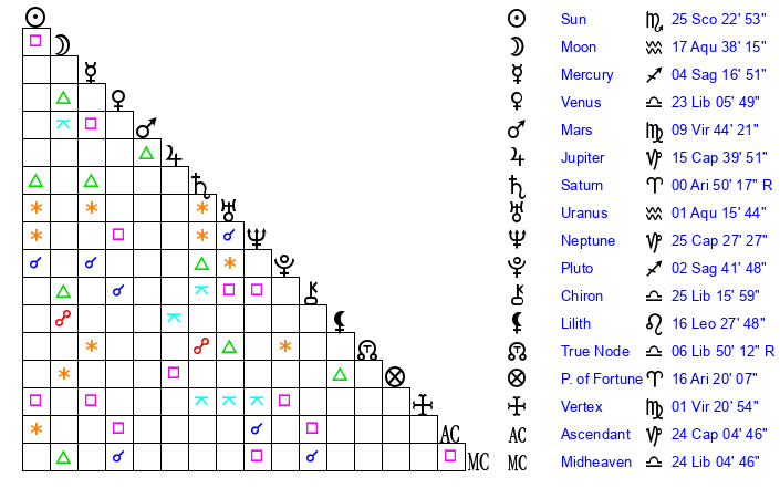 | Venus | 22 Libra 52 | 12 Scorpio 57 | 28 Scorpio 48 |