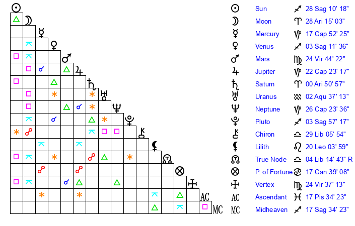 | Moon | 21 Aries 16 | 18 Sagittarius 49 | 14 Taurus 45 |