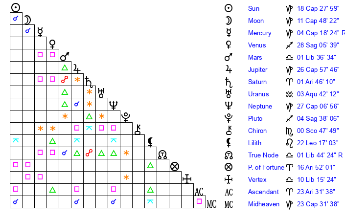| Neptune | 27 Capricorn 6 | 29 Pisces 36 | 28 Capricorn 11 |
