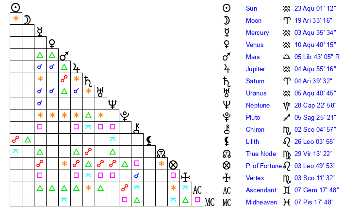 | Venus | 10 Aquarius 7 | 4 Aries 40 | 15 Pisces 7 |