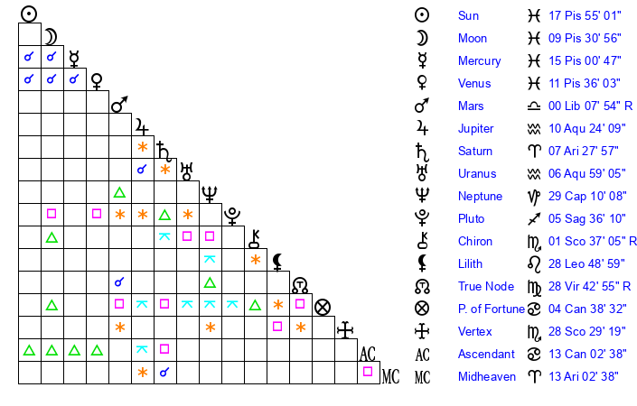 | Moon | 6 Pisces 45 | 7 Cancer 55 | 15 Pisces 24 |