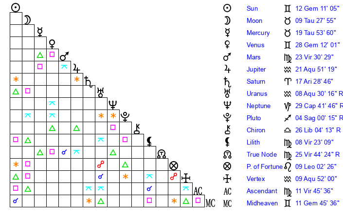 | Sun | 11 Gemini 46 | 11 Gemini 59 | 8 Cancer 31 |