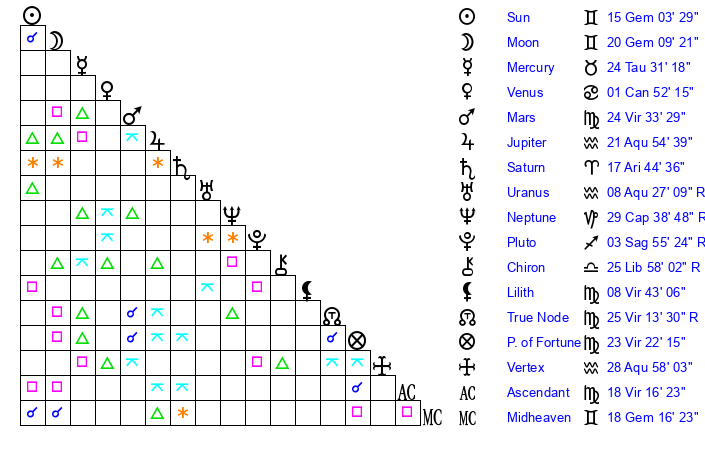 | Moon | 14 Gemini 15 | 8 Libra 25 | 23 Gemini 21 |