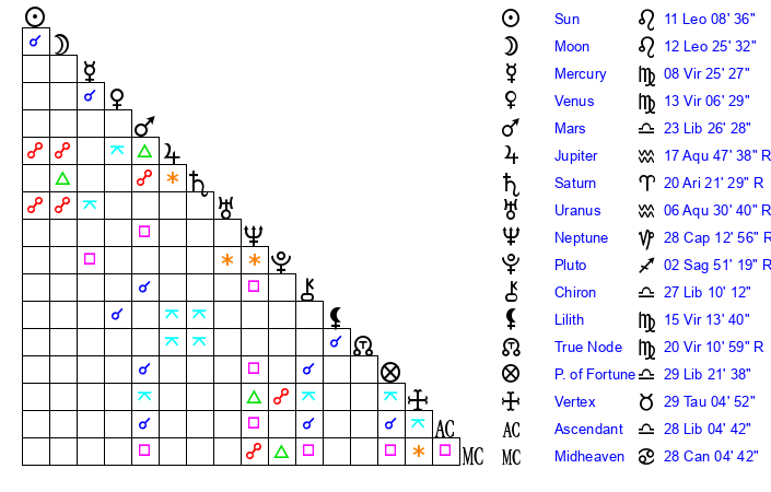 | Moon | 10 Leo 3 | 0 Sagittarius 13 | 19 Leo 4 |