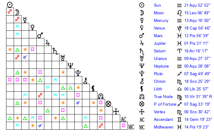 | Neptune | 0 Aquarius 26 | 28 Pisces 15 | 1 Aquarius 19 |