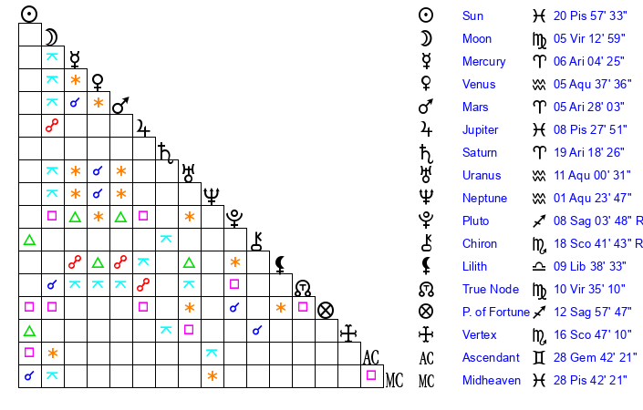 | Neptune | 1 Aquarius 22 | 29 Pisces 16 | 1 Aquarius 57 |
