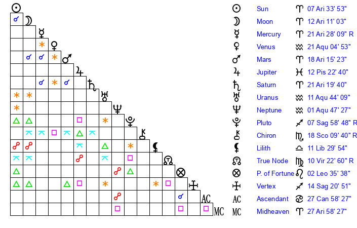 | Saturn | 21 Aries 7 | 23 Pisces 57 | 24 Aries 31 |
