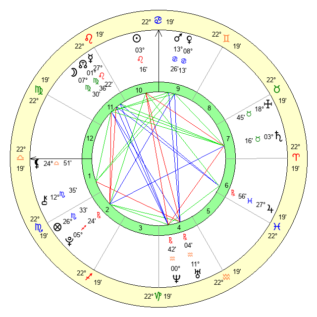 | Moon | 5 Virgo 9 | 22 Leo 0 | 0 Virgo 58 |
