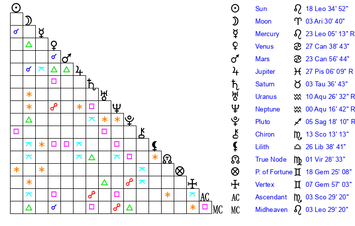 | Neptune | 0 Aquarius 16 | 1 Aries 48 | 29 Capricorn 40 |