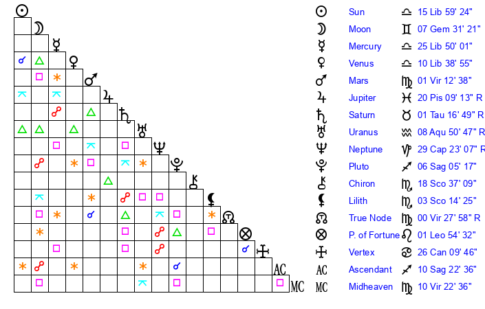| Venus | 10 Libra 22 | 24 Virgo 17 | 14 Scorpio 11 |