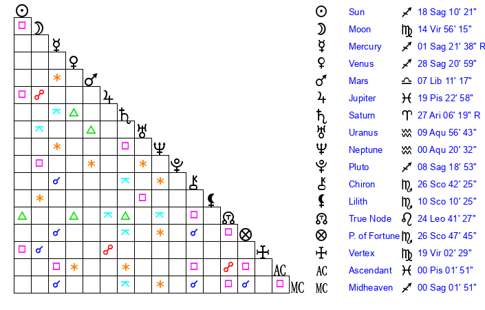 | Moon | 12 Virgo 37 | 29 Leo 28 | 7 Virgo 51 |