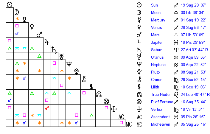 | Venus | 29 Sagittarius 23 | 13 Sagittarius 7 | 3 Aquarius 15 |