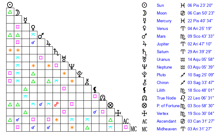 | Sun | 6 Pisces 12 | 6 Pisces 54 | 2 Aries 11 |