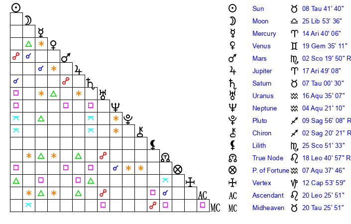 | Moon | 23 Libra 31 | 29 Taurus 59 | 8 Libra 38 |