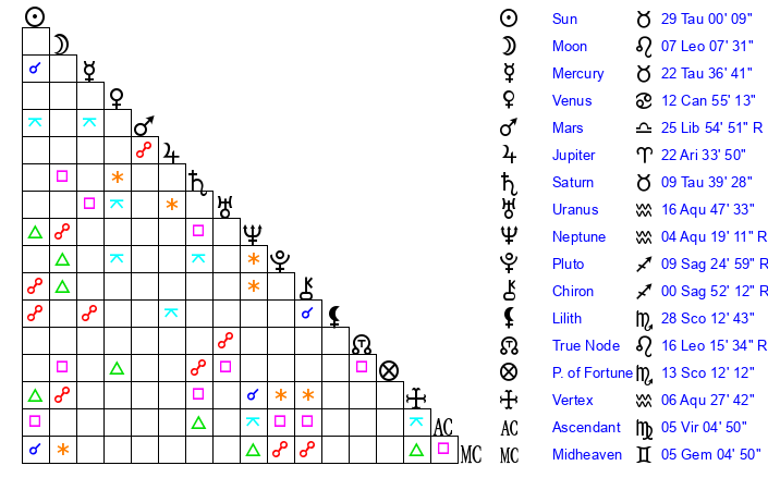| Sun | 28 Taurus 49 | 29 Taurus 30 | 23 Gemini 44 |