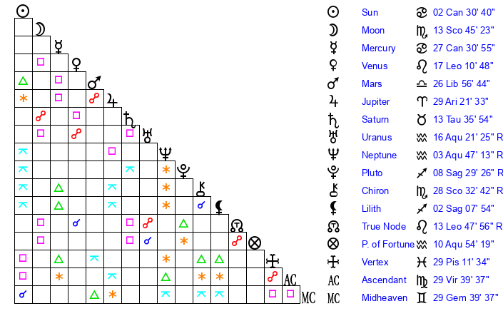 | Moon | 11 Scorpio 32 | 16 Gemini 59 | 26 Libra 7 |