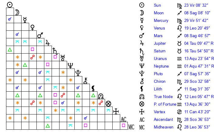 | Mercury | 29 Virgo 32 | 26 Virgo 7 | 9 Scorpio 57 |