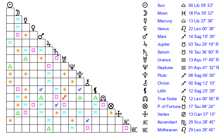 | Moon | 15 Pisces 31 | 28 Libra 45 | 26 Aquarius 44 |