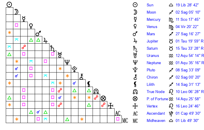 | Neptune | 1 Aquarius 34 | 0 Aries 12 | 1 Aquarius 45 |
