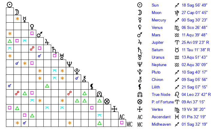 | Sun | 18 Sagittarius 45 | 19 Sagittarius 42 | 14 Capricorn 13 |