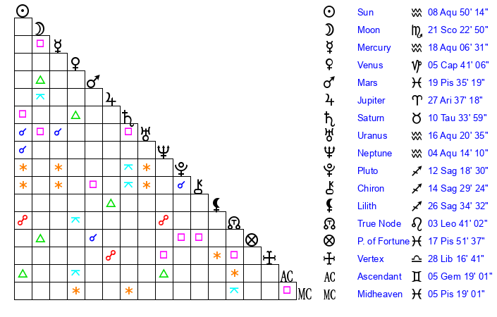 | Moon | 19 Scorpio 7 | 6 Aquarius 15 | 19 Libra 32 |