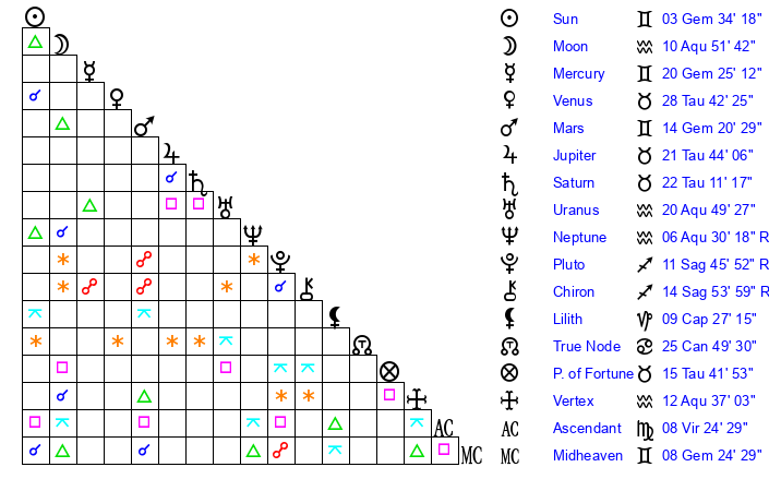 | Jupiter | 21 Taurus 45 | 26 Gemini 17 | 27 Taurus 28 |