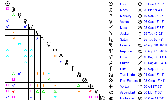 | Moon | 23 Pisces 44 | 16 Gemini 59 | 26 Aquarius 24 |
