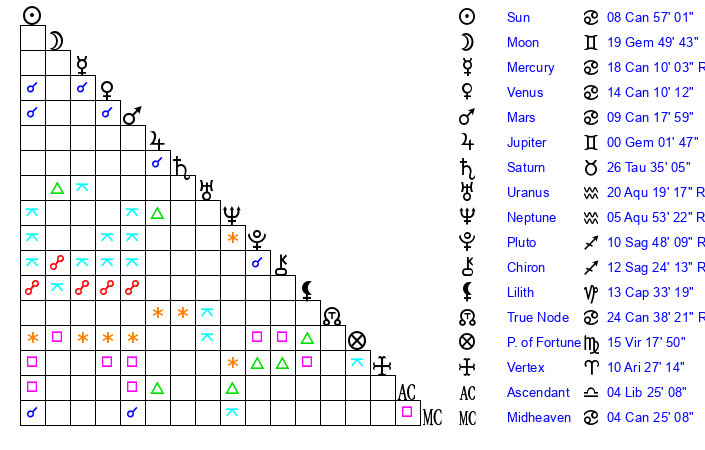 | Mercury | 18 Cancer 15 | 4 Leo 16 | 13 Cancer 11 |