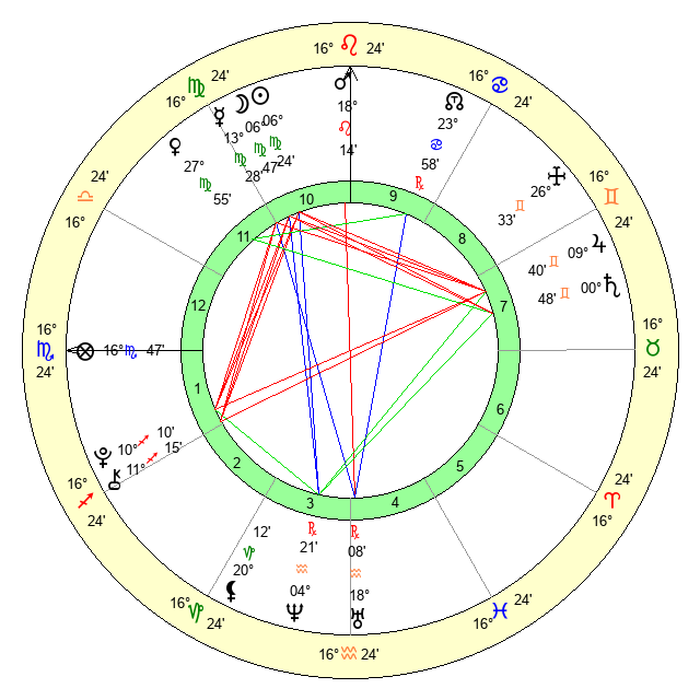 | Moon | 4 Virgo 2 | 14 Scorpio 27 | 29 Cancer 38 |