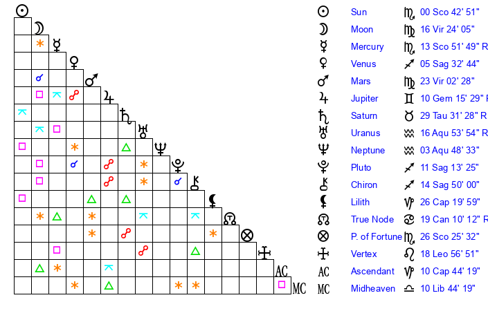| Mercury | 14 Scorpio 16 | 22 Scorpio 58 | 6 Scorpio 11 |