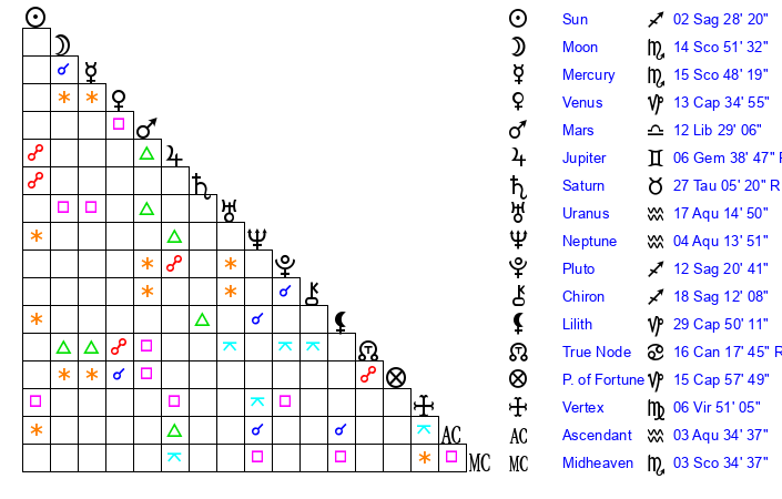 | Sun | 2 Sagittarius 17 | 2 Sagittarius 13 | 27 Sagittarius 40 |