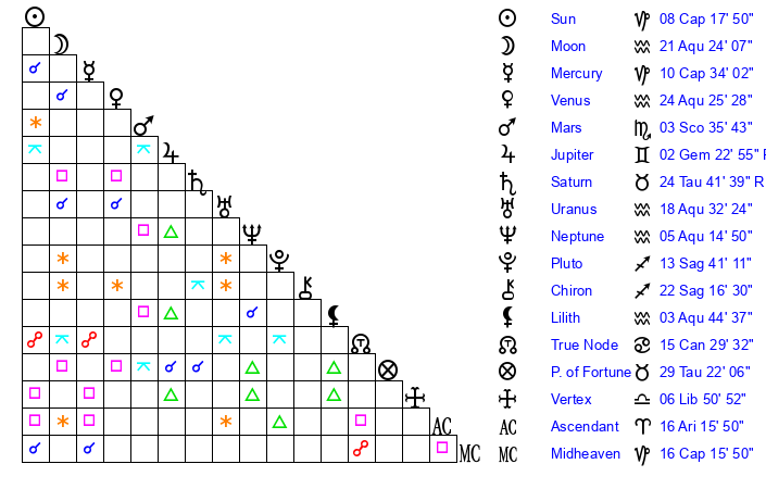 | Moon | 16 Aquarius 14 | 18 Sagittarius 7 | 7 Capricorn 38 |
