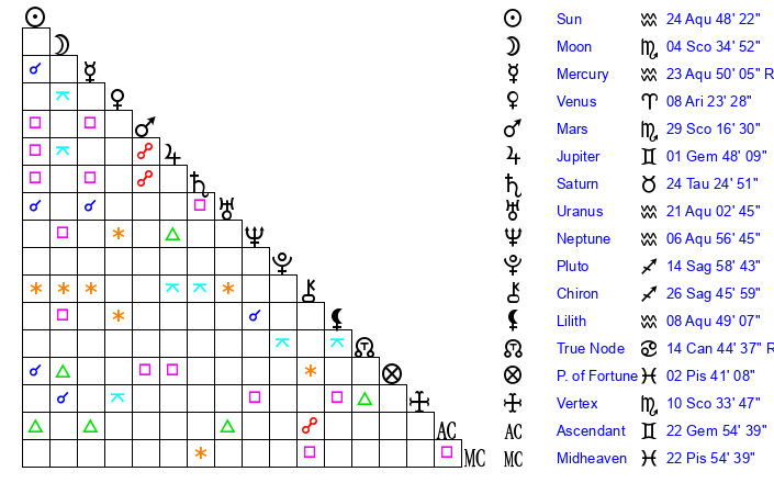 | Neptune | 6 Aquarius 56 | 28 Pisces 20 | 7 Aquarius 45 |