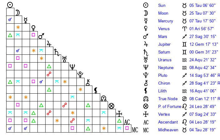 | Moon | 25 Taurus 13 | 0 Aries -28 | 11 Aries 9 |