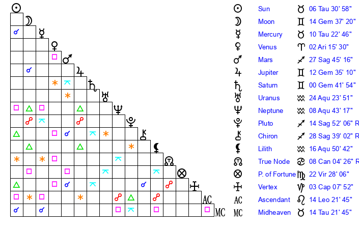 | Saturn | 0 Gemini 30 | 27 Pisces 16 | 3 Gemini 33 |