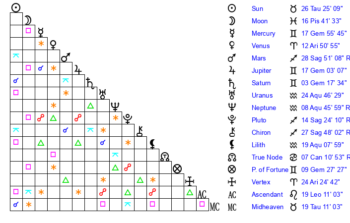 | Sun | 26 Taurus 26 | 26 Taurus 37 | 19 Gemini 27 |